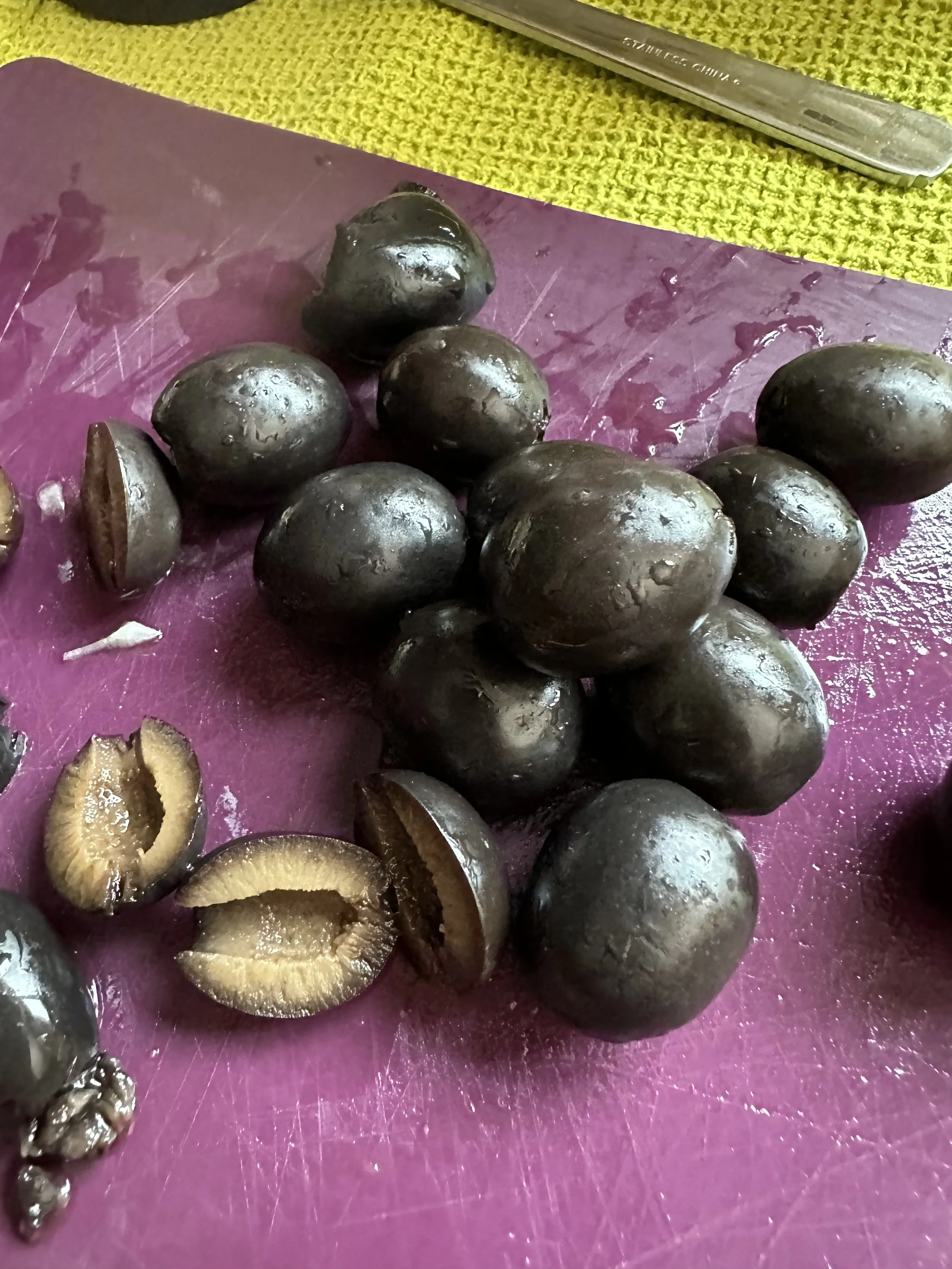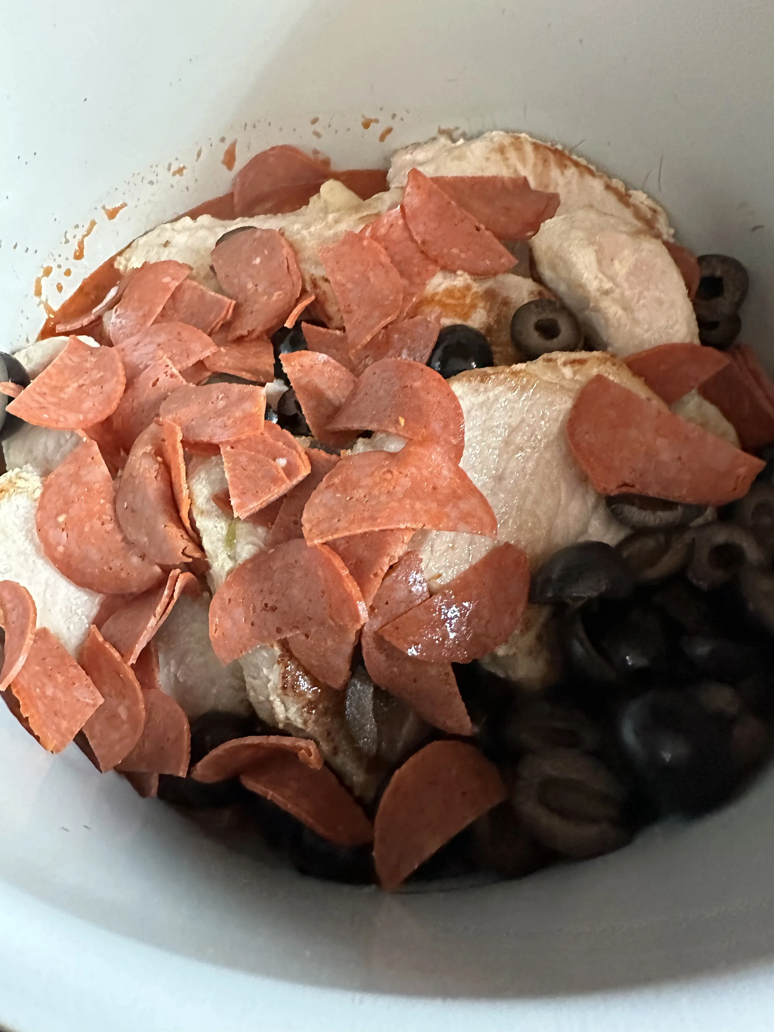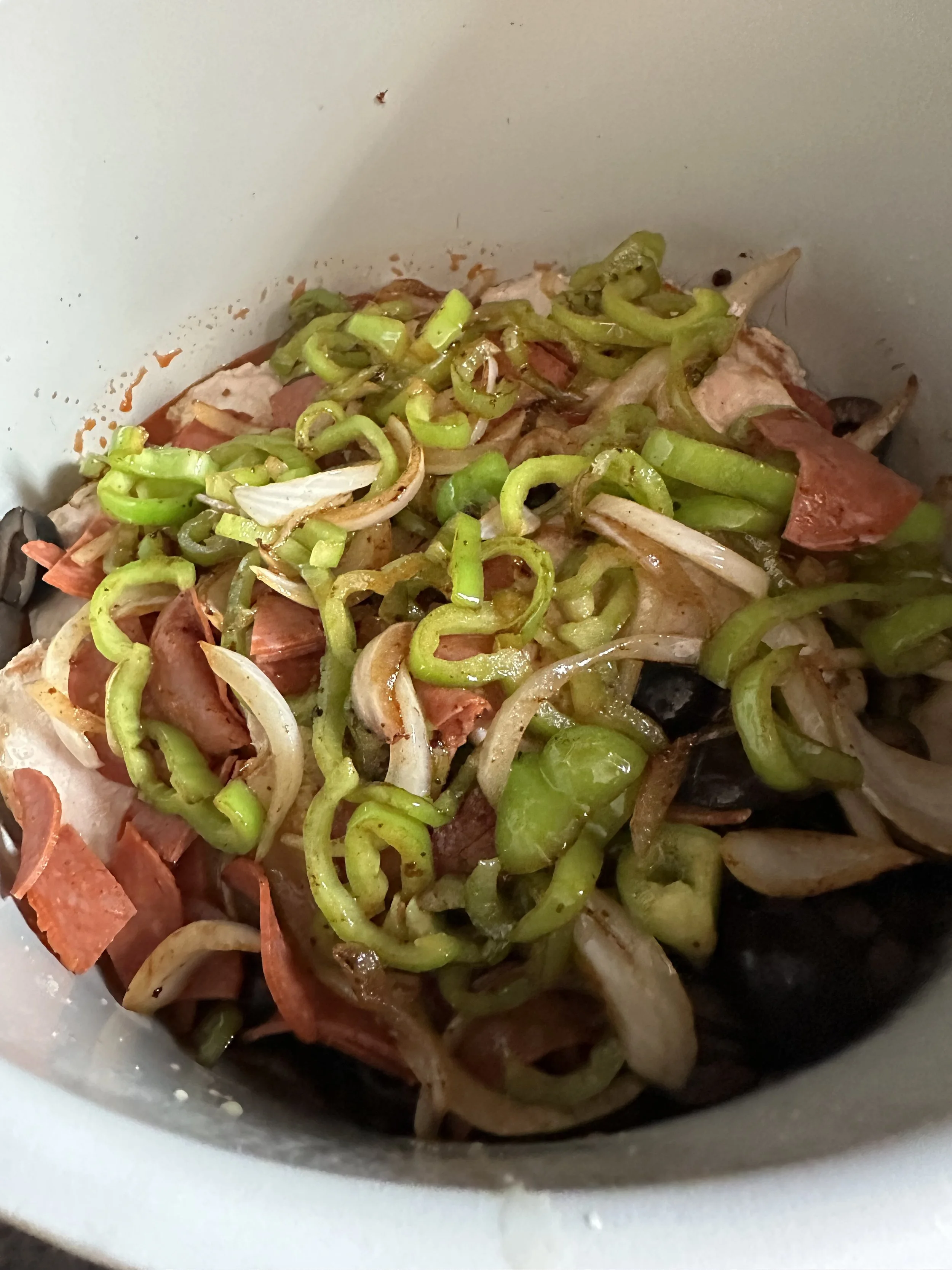 Add the peppers and onions, the black olives and the pepperoni to the mixture in crockpot.