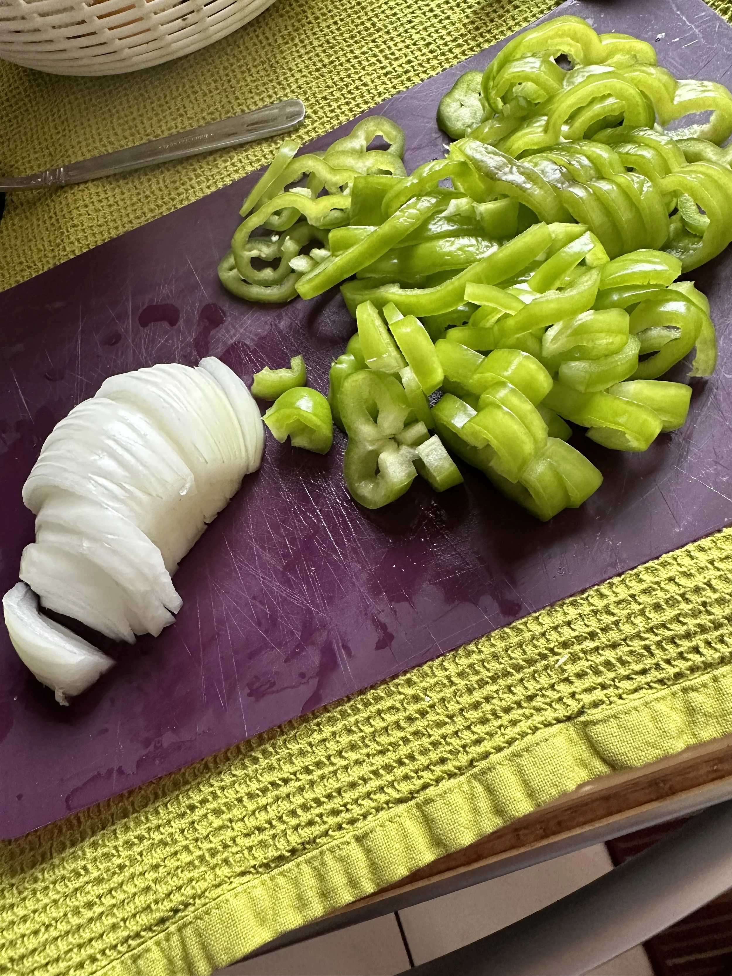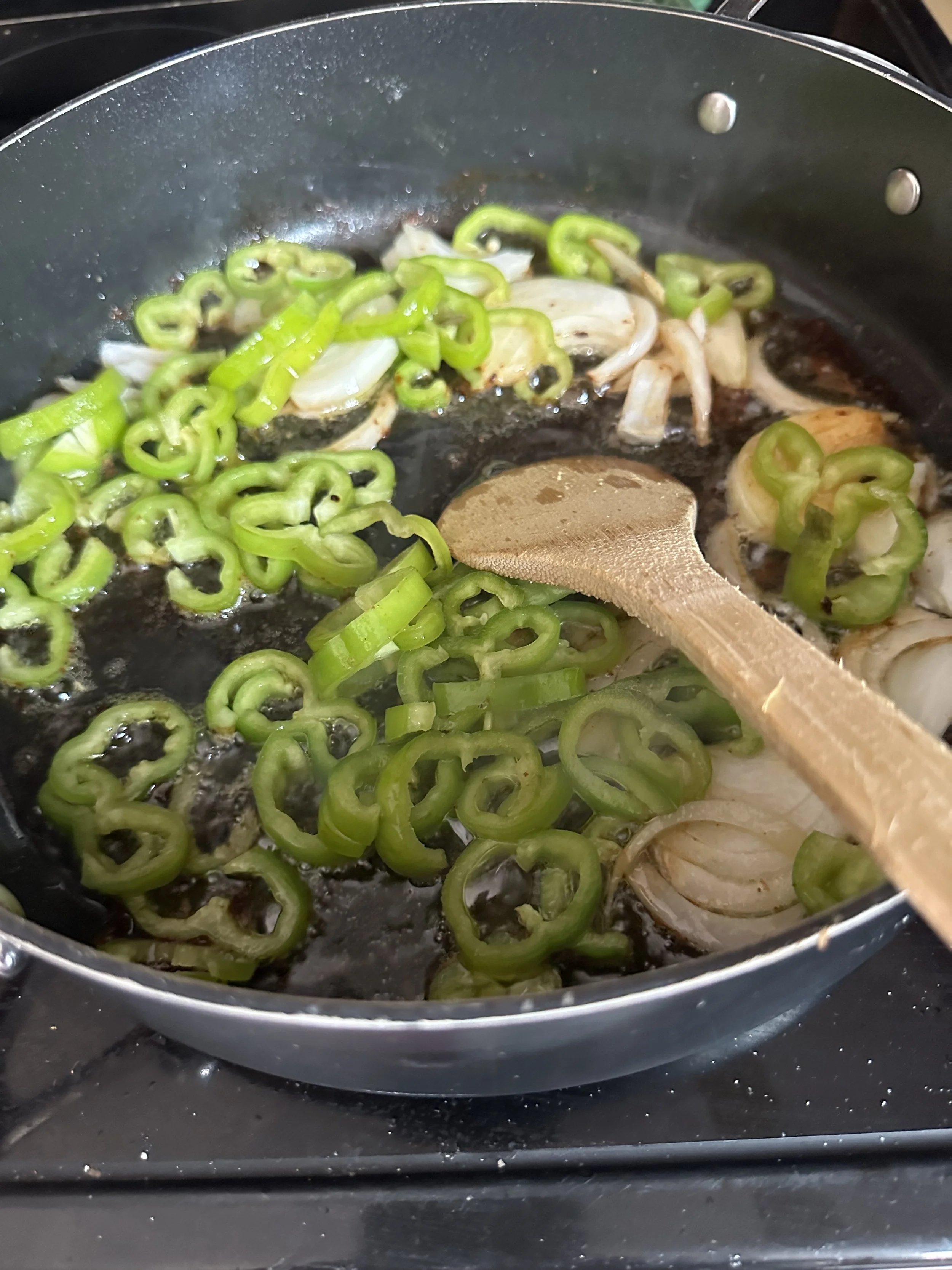 In a pan, cook the diced onion and peppers in a little bit of olive oil until soft